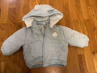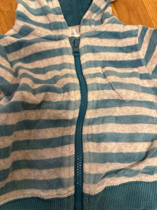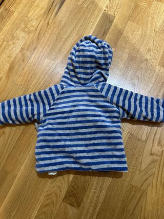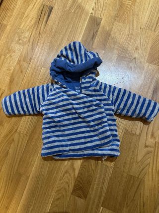 Abrigo de Zara para bebé con un diseño de rayas azules y grises. - Talla 3-6 meses (68 cm). - Capucha incorporada. - Cierre cruzado.