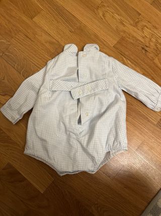 Pelele de bebé de manga larga, ideal para los meses más frescos. Presenta un diseño de cuadros pequeños en tonos azul claro y blanco. - Talla: 3 meses, incluso hasta los 6 meses - Manga larga. - Estampado de cuadros. - Cuello con detalle. - Cierre de botones en la parte inferior.
