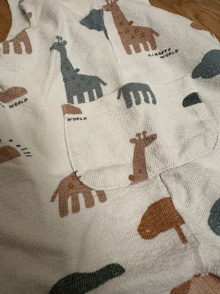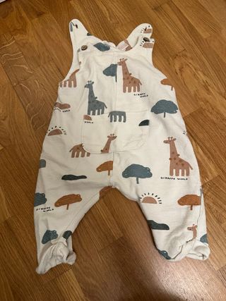 Peto de Zara para bebé, talla 3-6 meses, con un divertido estampado de jirafas y elementos de la naturaleza. - Diseño con estampado de jirafas, árboles y soles. - Tejido suave y cómodo. - Cierre con botones en los tirantes. - Pies incorporados.