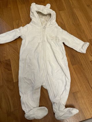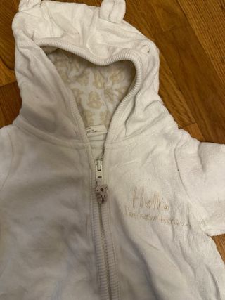 Buzo de terciopelo para bebé, talla 3 meses. Con capucha y orejitas. - Cierre de cremallera. - Pies incorporados. - Interior forrado con estampado.