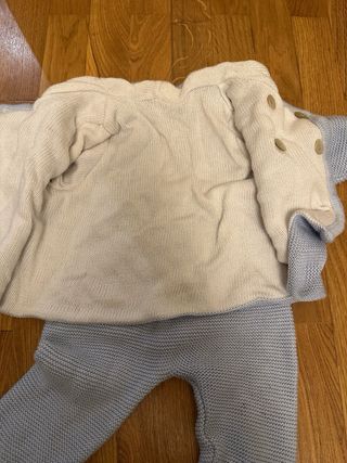 Conjunto de punto para bebé de la marca Neck & Neck, talla 3 meses. Incluye chaqueta y polaina. - Chaqueta con botones de madera. - Polaina con pies. - Tejido suave y confortable.