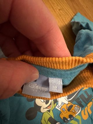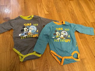 Conjunto de dos bodies de manga larga para bebé con estampado de Mickey Mouse. - Talla 3 meses. - Diseño Time to fill up!. - Uno gris con ribete verde y otro azul con ribete naranja. - Cierre de broches en la parte inferior.