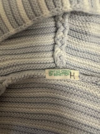 Chaqueta de punto para bebé de la marca Benetton. - Talla 3 meses. - Diseño a rayas en tonos blanco y azul claro. - Capucha con detalles de pompón. - Cierre de botones.