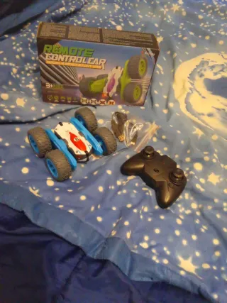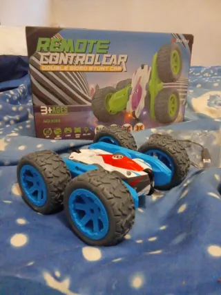 Coche teledirigido con mando a distancia, ideal para realizar acrobacias. Incluye el coche, el mando y cables de carga. - Diseño llamativo en blanco, azul y rojo. - Ruedas grandes para mayor agarre. - Mando a distancia ergonómico. -. En el mando tiene pilas, nose cuanta duración