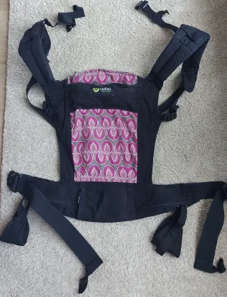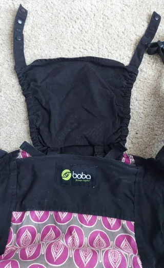Mochila de porteo de la marca Boba, en color negro con un panel frontal estampado en morado y gris. - Panel frontal con estampado de hojas. - Tirantes acolchados. - Cinturón lumbar ajustable. Usado pero bien conservado. Incluye funda para los dias de mas frío.