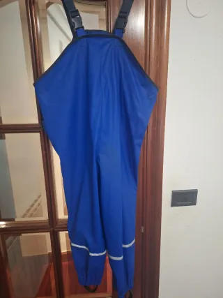 Pantalón impermeable de color azul para niño. Ideal para protegerse de la lluvia y el agua. -Talla 140 - Tirantes ajustables. - Bandas reflectantes en los bajos. - Tejido resistente al agua.