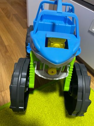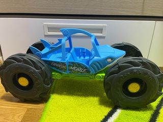 Divertido coche de juguete con diseño de tiburón. - Color azul y verde. - Ruedas grandes todoterreno. - Inscripción Thrash Mobile en los laterales. NO SE ENVIA
