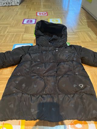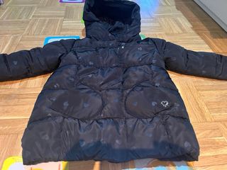 Chamarra negra para niña de la marca Mayoral, talla 5 años. Presenta un diseño acolchado con estampado de corazones. - Color negro. - Estampado de corazones. - Capucha integrada.