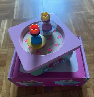 Caja musical con figuras de princesas y carruaje. - Diseño con carruaje y detalles de rosas. - Figuras de madera con coronas. - Base cuadrada rosa.