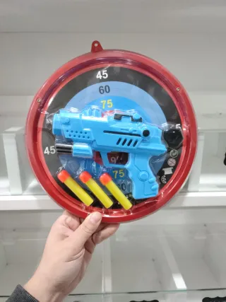 Set de pistola de juguete azul con diana y tres dardos. - Diana con números de puntuación. - Tres dardos de gomaespuma con punta naranja.