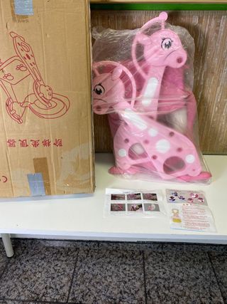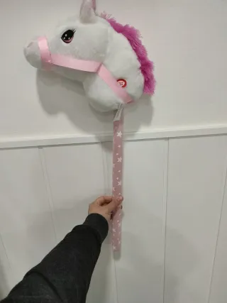 Unicornio de palo con un divertido sonido. - Peluche blanco con crin y detalles en rosa. - Incluye brida rosa. - Cinta con estrellas rosas.