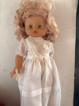 Preciosa muñeca vestida de comunión. - Vestido blanco con detalles de encaje. - Incluye un pequeño detalle floral en el vestido. - Lleva un collar dorado con un colgante. Las medidas del anuncio están puestas al azar
