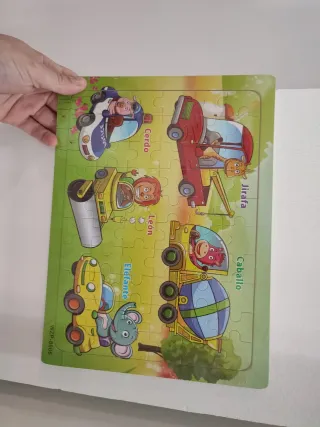 Divertido puzzle infantil con ilustraciones de animales y vehículos. - Incluye un cerdo en un coche de policía - Un león en un rodillo. - Una jirafa en un camión grúa. - Un caballo en una hormigonera. - Un elefante en un coche amarillo.