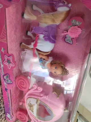 Set de juego con carruaje, princesa y caballo. - Carruaje de color rosa con detalles. - Figura de princesa con vestido. - Caballo blanco con crin rubia y manta morada. - Incluye accesorios como un cepillo.