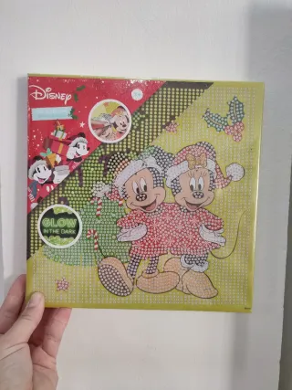 Cuadro decorativo de Mickey y Minnie con temática navideña, realizado con la técnica de diamantes. - Diseño de Disney con Mickey y Minnie. - Motivo de Navidad. - Incluye la indicación Glow in the Dark (brilla en la oscuridad).