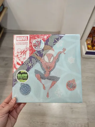 Cuadro de diamantes de Spiderman de Marvel. Un diseño divertido y llamativo. - Incluye diamantes que brillan en la oscuridad. - Diseño de Spiderman con detalles en rojo y azul. - Ideal para fans de Marvel.