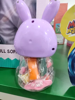 Adorable conejito de plástico morado, ideal como contenedor. - Diseño de conejito con orejas. - Cuerpo transparente con bloquecitos de plastilina en su interior. - Detalles faciales pintados.