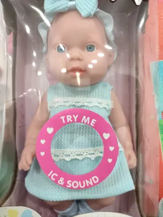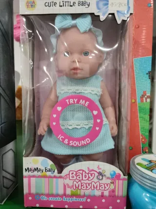 Muñeca bebé de la marca MayMay Baby, con un bonito vestido azul y lazo en la cabeza. - Incluye sonido. - Vestido de tela con detalles de encaje. - Lazo azul en la cabeza.