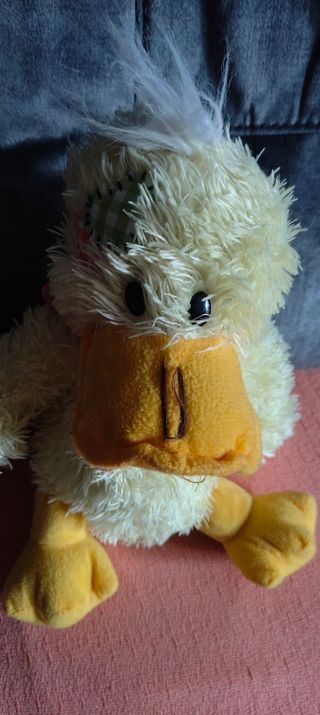 Peluche de pato con peli largo, mide 32 CMS de alto. Muy buen estado.