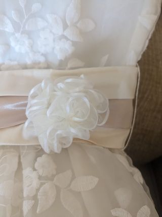 Vestido de Sfera de 4-5 años. Se le ha puesto un fajín con unas flores. Color blanco roto. El fajín se puede quitar. Medias a juego con dibujo bordado lateral. Uso de un dia