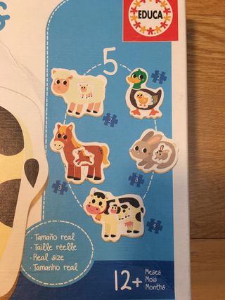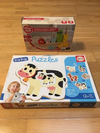 Se venden dos juguetes para bebés mayores de un año. Son ideales para el desarrollo de la motricidad fina y el aprendizaje. HAGO LOTES - Incluye un puzzle de animales de granja con 5 piezas grandes y fáciles de manipular. - También un juego de encajables con figuras de animales de colores brillantes y formas divertidas. - Los juguetes están en buen estado y listos para jugar.