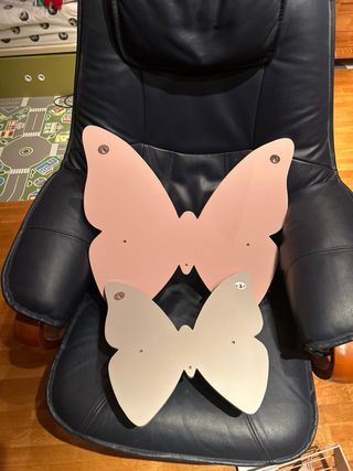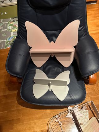 Conjunto de dos estanterías decorativas con forma de mariposa, perfectas para una habitación infantil. - Estantería grande en color rosa palo. - Estantería pequeña en color blanco roto. - Diseño mariposa.