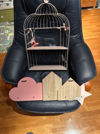 Conjunto decorativo infantil con forma de jaula y figuras. - Jaula decorativa con dos estantes. - Figuras de madera con forma de estrella, casa y nube. - Incluye perchas de madera en las figuras.