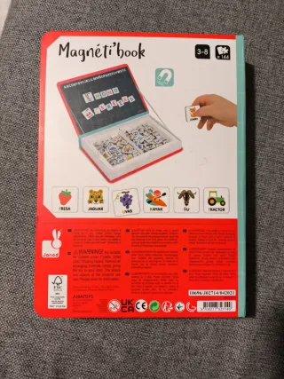 Libro magnético Janod para aprender el alfabeto en español. Incluye 144 imanes. - Diseño divertido con animales e ilustraciones. - Ideal para niños de 3 a 8 años. - Fomenta el aprendizaje de letras y vocabulario.