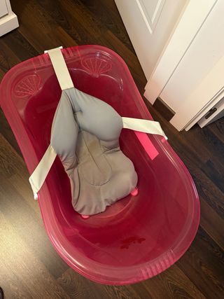 Bañera para bebé de color rosa, diseñada para facilitar el baño del recién nacido. Incluye un soporte para mayor comodidad. - Material: Plástico resistente. - Color: Rosa translúcido. - Incluye soporte de tela para bebé.