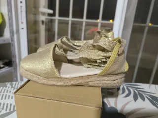 Alpargatas de estilo fallero en color dorado, talla 31. Perfectas para lucir en fiestas y eventos. - Diseño con tiras para atar al tobillo. - Acabado brillante y festivo. Preferible entrega en mano. No envio por walla pop.