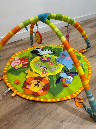 Divertido parque infantil para bebés con un gimnasio integrado y varios juguetes colgantes. - Diseño con animales de la selva. - Colores vivos y alegres. - Incluye sonajero de sol y otros muñecos. - Base acolchada para mayor comodidad.