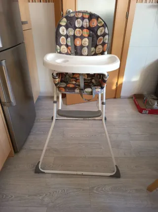 Trona de bebé con un divertido estampado de animales. - Estructura metálica. - Bandeja de plástico. - Plegable para fácil almacenamiento.