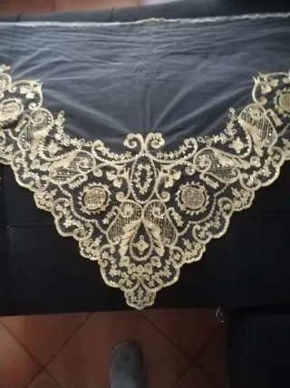 Manteletas con un diseño intrincado y elegante, adornadas con bordados dorados y detalles de pedrería. - Diseño floral y ornamental. - Bordados en hilo dorado. - Adornos de pedrería y lentejuelas. - Borde festoneado.