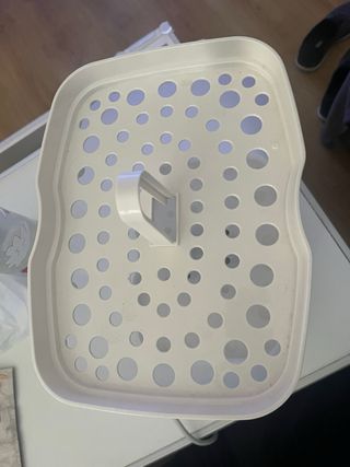 Esterilizador de biberones de plástico blanco y gris. - Diseño con rejilla central. - Asa para transporte.
