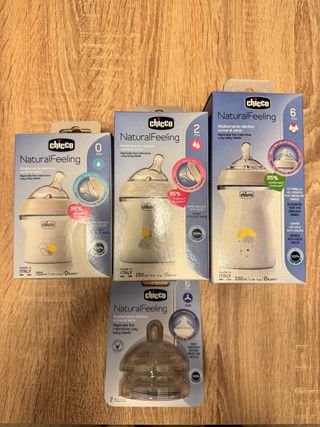 Set de biberones Chicco NaturalFeeling, ideales para replicar la alimentación instintiva. Fueron un regalo pero no los necesitamos. No los hemos usado ni abierto. - Biberón de 150 ml (0m+) - Biberón de 250 ml (2m+) - Biberón de 330 ml (6m+) - Tetinas para comida (6m+) - Tetinas anticólicos. - Fabricados en Italia. - Libres de BPA.