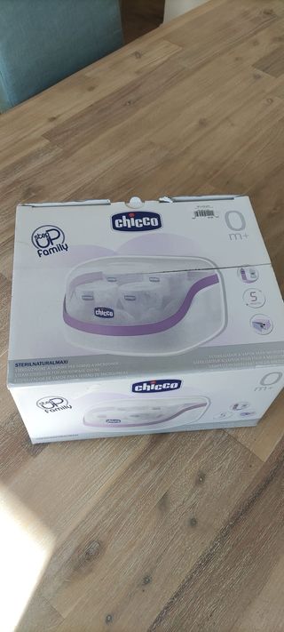 Esterilizador y calentador de biberones de la marca Chicco. ESTA SIN USAR - Calienta en 3 minutos. - Esteriliza en 5 minutos. - Elimina hasta el 99,9% de los gérmenes domésticos. - Conserva los nutrientes de la leche materna. - Programas dedicados para bolsas de leche, biberones de vidrio y con base.