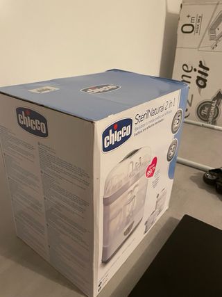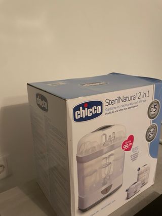 Chicco Esterilizador SterilNatural 2 en 1 se trata de un esterilizador a vapor totalmente eléctrico. Permite escoger entre dos modos de configuración: tamaño completo o tamaño compacto. Desinfecta en 5 minutos. Ha tenido poco uso, el estado general es bueno.