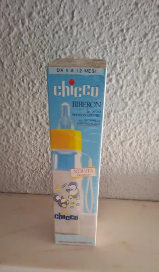 Biberón Chicco de vidrio termo-resistente, ideal para bebés de 4 a 12 meses. Diseñado con tetina antiescolicos. - Material: Vidrio termo-resistente. - Edad recomendada: 4 a 12 meses. Vintage Precintado