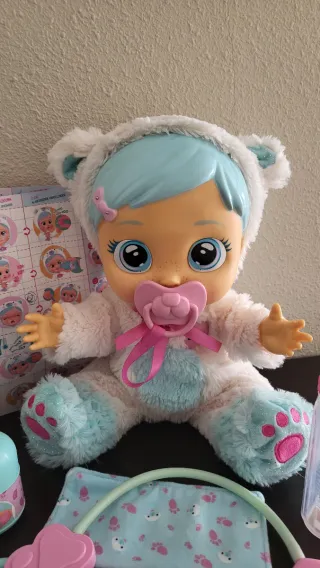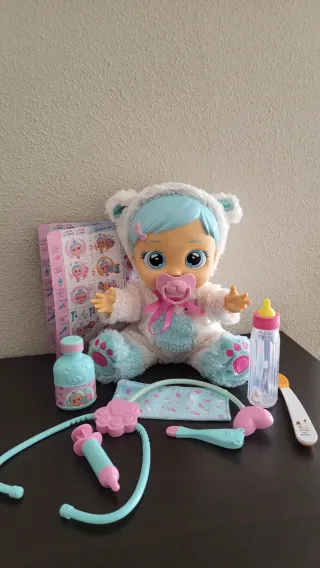 Muñeca Bebé Llorón Cristal con accesorios para cuidarla. Incluye biberón, jeringuilla, termómetro y más. - Muñeca con traje de oso. - Accesorios de doctor. - Instrucciones incluidas.