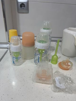 Conjunto de biberones y accesorios para bebés. - 2 Biberones de cristal Dr Brown, 1 plástico De Brown”s, 1 de plástico de suavinex y 1 plástico de medela - Incluye tetinas y otros complementos. Chupetes diferentes marcas(suavinex...) No los quería r mi hijo