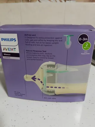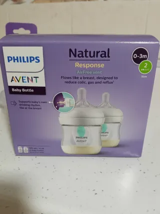 Biberones Philips Avent Natural, 2 unds de 125 ml con sistema AirFree, sin BPA, para recién nacidos a partir de 0 meses (modelo SCY670/02) Los vendo porque mi bebe no acepta esa clase de tetina. - Biberones de plástico. - Flujo lento (tetina numero2) - Tapas protectoras incluidas. - Nuevo