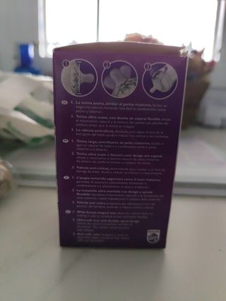 Todo completamente nuevo y sin estrenar ❗ el cepillo limpiador NO se incluye (fue lo único usado del pack original) Precio del pack completo: 60 € Precio original total: 84,95 € 1. Pack Philips Avent Natural Response (sin cepillo) • 2 biberones de 125 ml • 2 biberones de 260 ml • 1 chupete Philips Avent Tetinas incluidas: • 4 tetinas talla 2 (flujo lento) • 3 tetinas talla 3 (flujo medio) • 1 tetina talla 1 (flujo muy lento) extra 2. 2 packs de tetinas Natural Response – talla 1 (flujo muy lento). cada pack i2 tetinas. 3. Biberón de cristal Philips Avent 120 ml con tetina 2. 4. Vaso con boquilla Philips Avent para AC