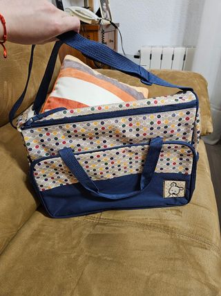vendo bolsa de bebe para meter pañales,ropita,etc .Tiene un bolsillo alante y luego el compartimento principal, y a ambos lados para poder meter botellas de agua o biberones una a cada lado.Dentro viene la esterilla para tumbar al bebe para cambiarle el pañal.Se ha usado muy poco.