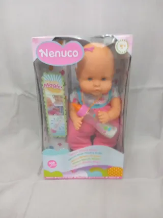 Muñeca Nenuco con su biberón mágico, lista para jugar. Recomendada para mayores de 10 meses. - Incluye biberón con efecto mágico. - Ropa de color rosa y gris. - Marca Nenuco.