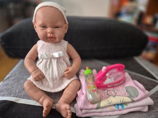 Muñeco bebé reborn muy realista. PACK MUÑECA + ROPA + ACCESORIOS: 140€ SOLO MUÑECA CON EL TRAJE PUESTO: 80€ -Cuerpo de relleno. -Movimiento en la cabeza realista -Pelo pintado pelo a pelo -Ropa real de bebé -Ojos cerrados -Imán en la boca para chupetes imantados EL PACK INCLUYE: -Muñeca como se muestra en la imagen (con chupete, body, pañal, zapatos y ropa) -Muselina blanca -Mini Oso de peluche -Zapatos -Pack calcetines -Leotardos blancos -Abrigo -2 chupeteros -Pijama con gorro -Chaqueta rosa -Pack manoplas -2 diademas -Traje rosa con gorro de punto -Pañales -Traje vestido -Camiseta blanca -Biberón de juguete -Patucos grises