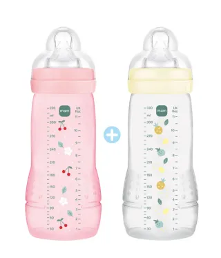 Biberón de la marca Mam, modelo Easy Active, con capacidad de 330ml y un bonito diseño en color rosa con cerezas y flores. - Fácil de sujetar por las pequeñas manos del bebé. - Desarrollado con expertos médicos. - Libre de BPA/BPS.