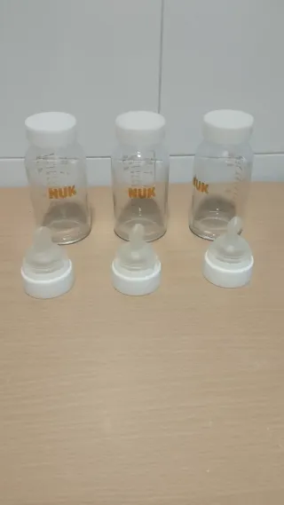 3 biberones de cristal sin estenar. Marca Nuk. Sólo la parte de abajo. Uno de 125 ml y dos de 230 ml. Lo siento, no hago envíos.