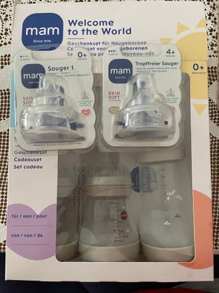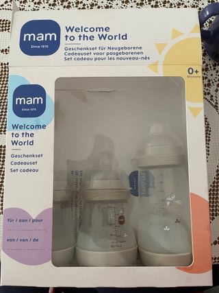 Set de regalo MAM para recién nacidos, ideal para dar la bienvenida al mundo. Incluye: 2 Biberones Anticólico de 160ml - ideal para recién nacido; 1 Biberón Anticólico de 260ml - A partir de 2 meses. Con 2 Tetinas 1 de flujo lento Con 2 Tetinas 2 de flujo medio - Apto para bebés de 0+ meses. Es un regalo, comprado en verano del 2025 y los biberones nunca fueron usados!