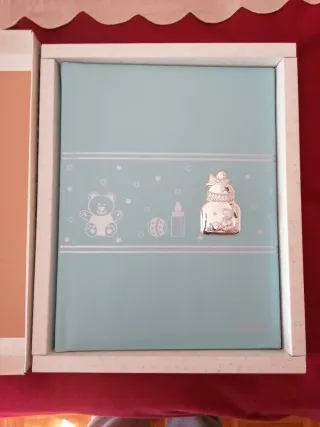 Álbum de fotos para recién nacidos con un diseño tierno y especial. - Cubierta de color azul claro. - Decorado con osito, biberón y estrellas. - Detalle plateado de un bebé. - Incluye dos cintas plateadas decorativas. Sin estrenar. Nuevo