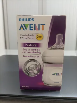 Biberón Philips Avent Natural de 125 ml (4 oz) para recién nacidos (0m+). - Diseño Natural para combinar con la lactancia materna. - Tetina con forma natural para un agarre sencillo. - Pétalos de confort y válvula anticólicos. - Libre de BPA.
